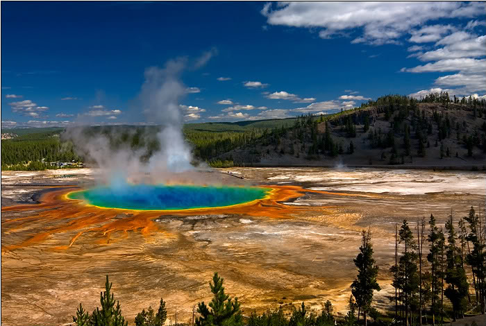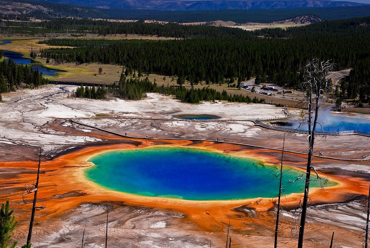 Ubicado en el Parque Nacional de Yellowstone, es el resort de agua caliente más grande de Estados Unidos y el tercero más grande del mundo. Grand Prismatic Spring es un respiradero hidrotermal, formado por bacterias termófilas, estas producen colores que tornan del verde al rojo, y la cantidad de color en los tapetes microbianos depende de la relación de la clorofila a los carotenoides y de la temperatura del agua. El resort representa toneladas de agua estéril debido a que están en constante hervor, lo que logra que se produzcan colores vibrantes, haciéndolo un lugar irresistible.